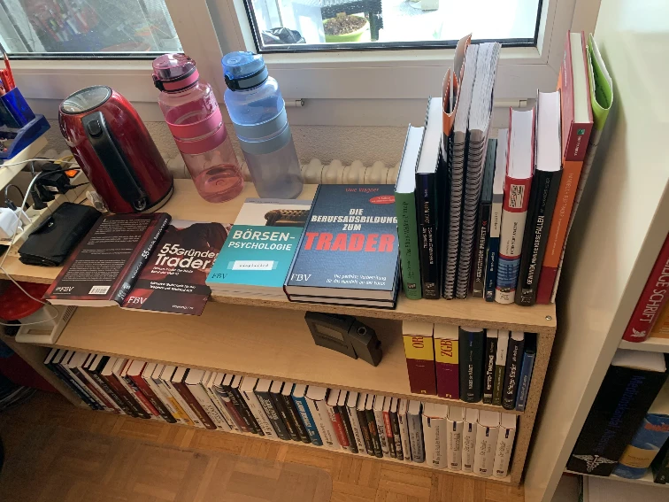 Meine 61 Trading-Bücher, wovon ich die 6 interessantesten Bücher 1-2 Mal gelesen habe.
